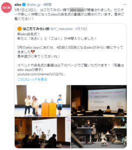 5月1日と2日に、はこだてみらい館でaibo daysが開催されました。セミナーや新しく仲間になったaiboの命名式の動画が公開されています。是非ご覧ください! https://t.co/loH1v7EMx4