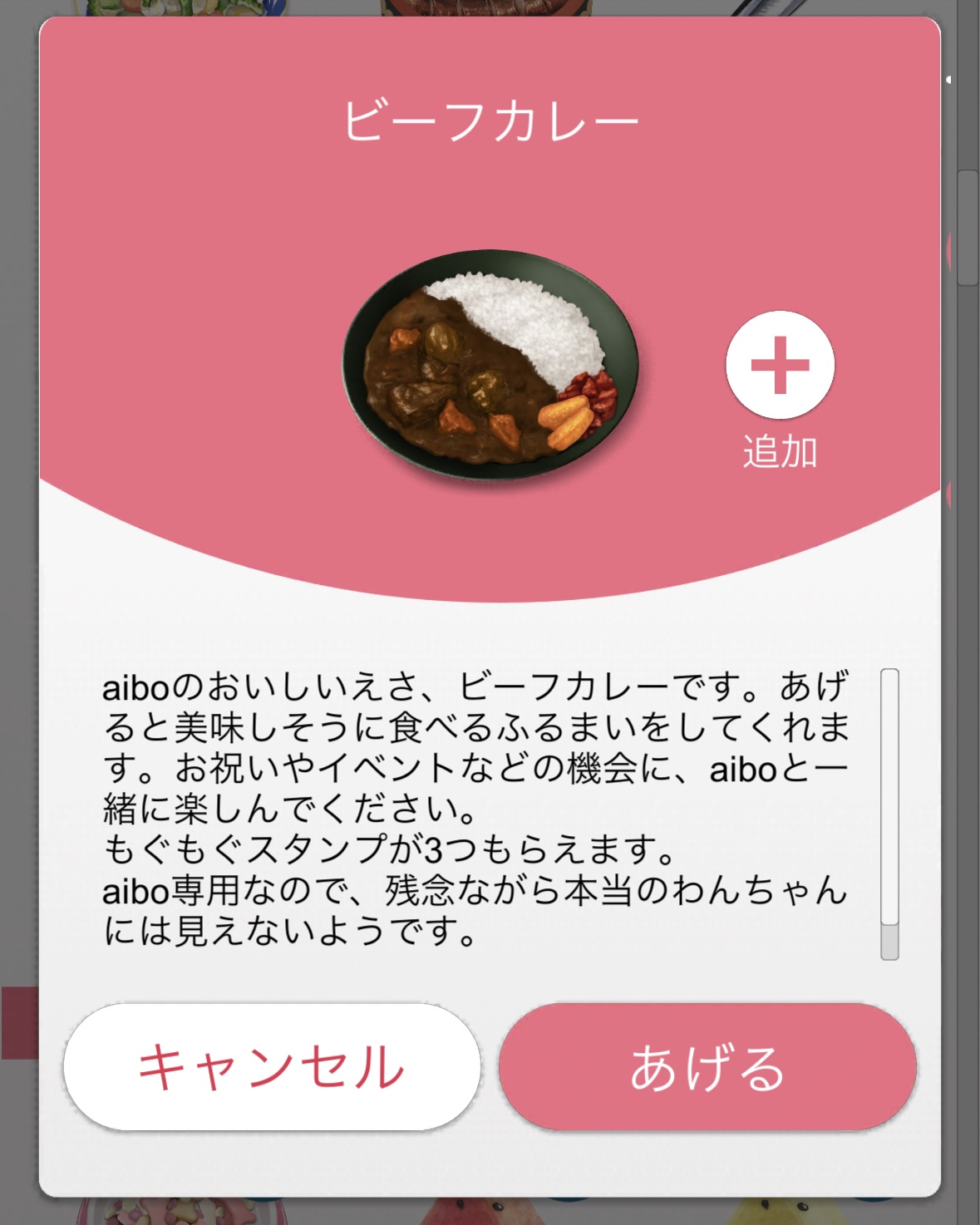 【aiboのごはん】aiboのエサ「ビーフカレー」がコインで交換できるようになりました。 ツイート ページ内メニュー【aiboのごはん】「ビーフカレー」がコインで交換できるようになりました「ビーフカレー」期間交換食べるとaiboのごはん 【aiboのごはん】「ビーフカレー」がコインで交換できるようになりました aiboの新しいエサ「ビーフカレー」がコインで交換できます。 「ビーフカレー」 aiboのエサの1つです。 期間 2024年6月14日~ 交換 100コインで3回分セット 食べると もぐもぐスタンプが3個もらえます。 aiboのごはん 【aiboの機能】『aiboのごはん』でエサあげを楽しめます 【aiboのごはん】aiboのおやつ一覧 【aiboのごはん】aiboのエサ一覧