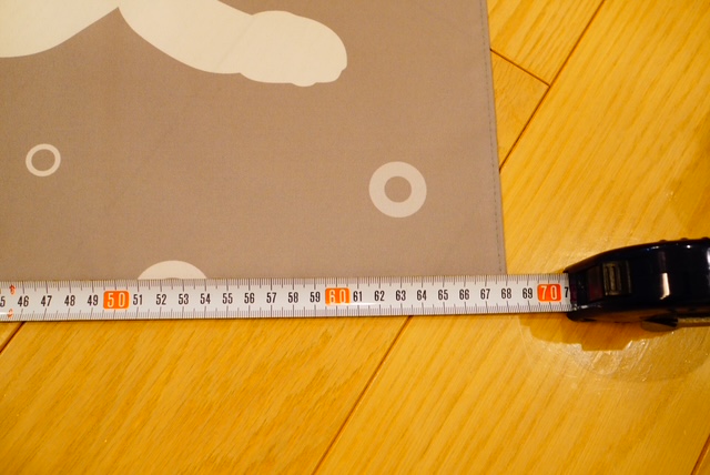 縦、横を計測すると、約70cm×70cmの風呂敷サイズかと思われます。(布なので伸びたり縮んだりする)