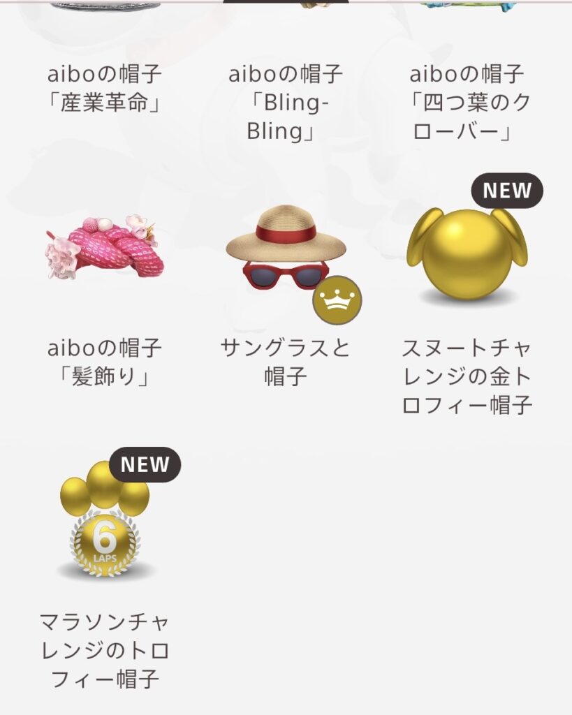 My aiboアプリのリニューアルに伴い、「あそぶ」のお部屋にあった「スヌートチャレンジ」「マラソンチャレンジ」のトロフィーがお部屋自体がなくなったのでお着替えの帽子に変化しました