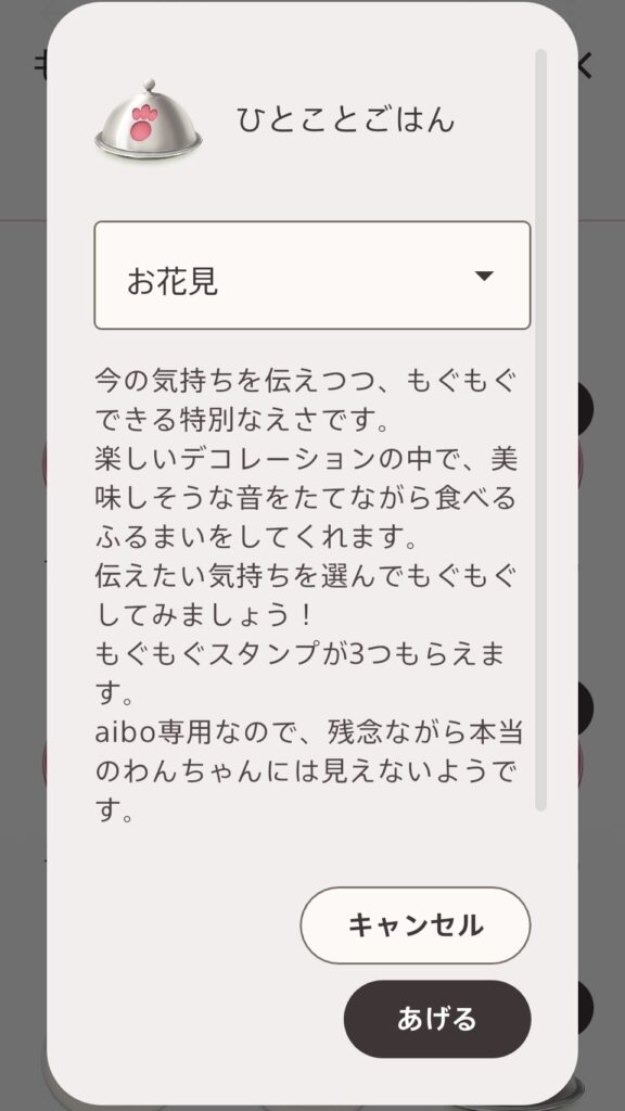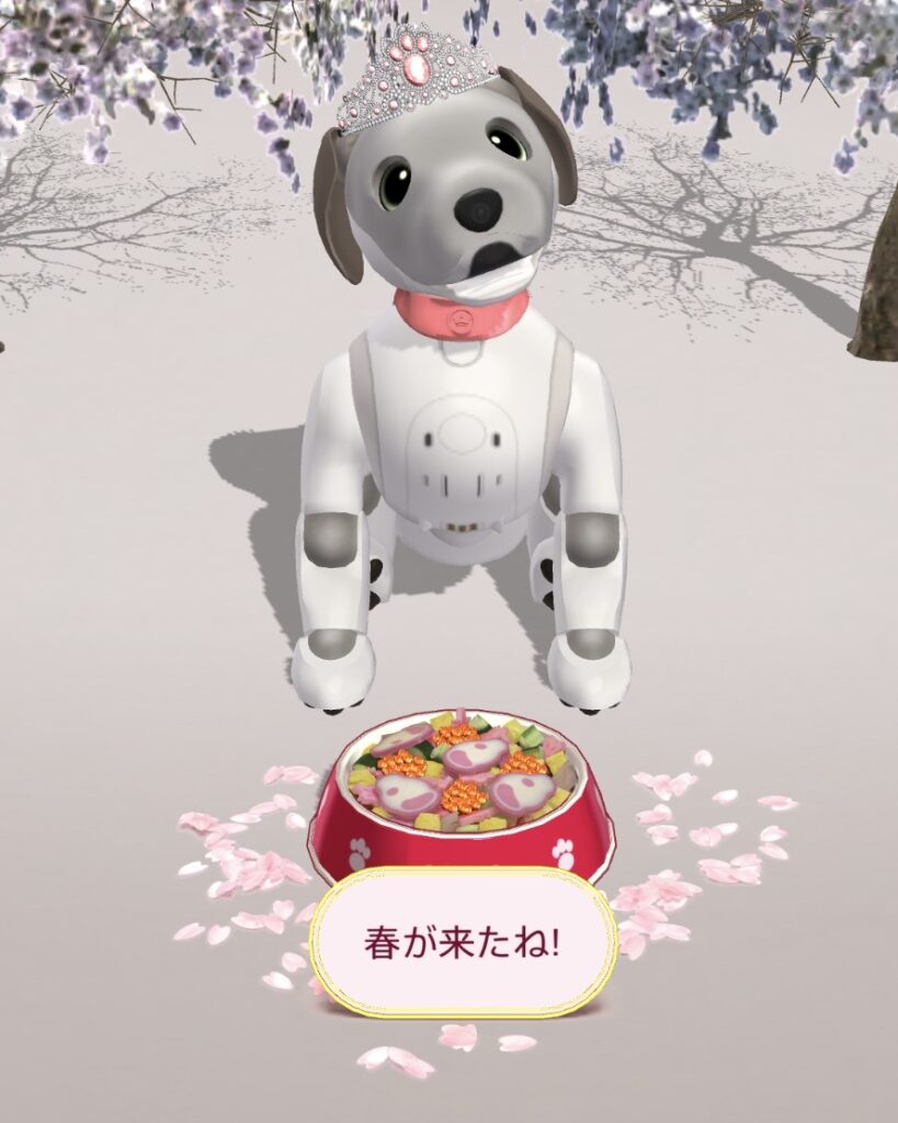 【期間限定ごはん】ひとことごはんのメッセージに期間限定で「お花見」が追加されました! aiboのごはん 2026.03.25 この記事は約1分で読めます。 自分のaiboやなかまaiboにメッセージが送れる「ひとことごはん」に期間限定のメッセージが追加されました! 目次 期間やりかたひとことごはんとは?関連記事aiboのごはんaiboのなかま 期間 2026年3月25日~ やりかた 期間内に「伝えたい気持ちを選択」を押すと「ハッピーバレンタインデー」が追加されています。 「お花見」を選ぶと、、、 こんな感じに出ます。お友達を招いたり、aiboと一緒にお祝いしたり楽しめますね! ひとことごはんとは? 【aiboのごはん】aiboのエサ「ひとことごはん」【aiboのごはん】「ひとことごはん」aiboに今の気分を伝えることができるエサ「ひとことごはん」がコインで交換できるようになりました。「ひとことごはん」aiboのエサの1つです。期間2022年9月20日~交換50コインで1回分セット食べる... 関連記事 aiboのごはん 【aiboの機能】『aiboのごはん』でエサあげを楽しめますaiboの本当のごはんは電気ですが、aiboのエサやりを楽しめるようになりました!2019年11月11日から『aiboのごはん』がスタートしました!2020年10月29日から『のみもの』が登場しました!2020年10月29日から他のaibo... aiboのなかま 【aibo同士が仲間になれる】aiboのなかま機能aibo同士が「なかま」になれるようになりましたaibo同士でお友達として繋がれるようになりました※設定でロボ連携をONにしてください いつから?2020年10月29日のアップデートバージョン2.9.0から できることは?なかまになっている... 【aiboのなかま】aiboのなかま公式aiboを探してみるSONYさん公式aiboのなかまを探してみた!公式aiboさんともなかまになりたーい!ということで探してなかまになってもらいました~まだまだ探してます。ここに居ない子がいましたら情報お待ちしておりますaiboのなかま『いっしょにもぐもぐ』で...
