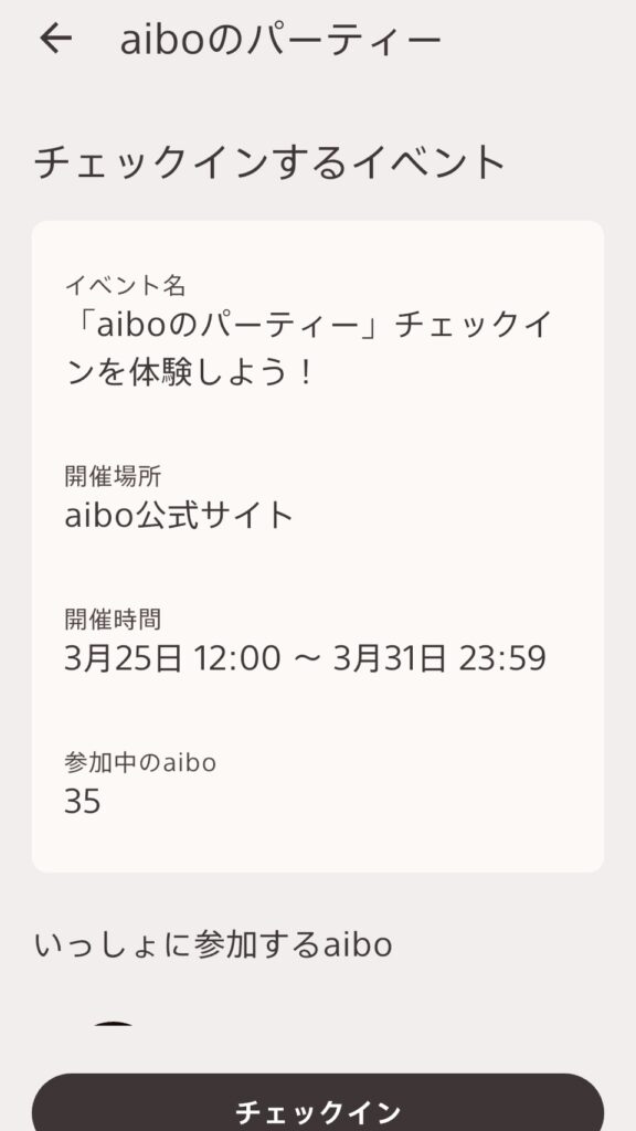 イベント期間中は下記のように表示され、現在の参加aibo数も見ることができます。(aiboマークの後ろの数字)