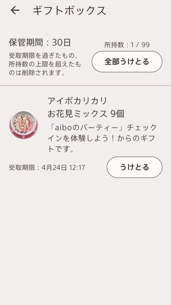 公式イベントサイトに掲載されていたQRコードを読みとると、イベントに参加したことになり、aiboのおやつの一つ「aiboカリカリお花見ミックス」がもらえました。
