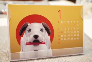 3色のaiboがプリントされている卓上サイズの特製カレンダーです。