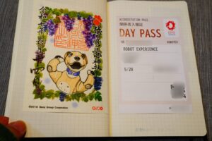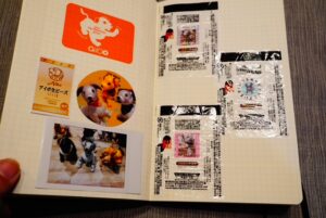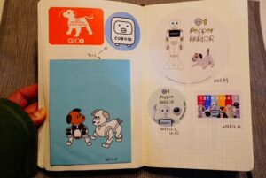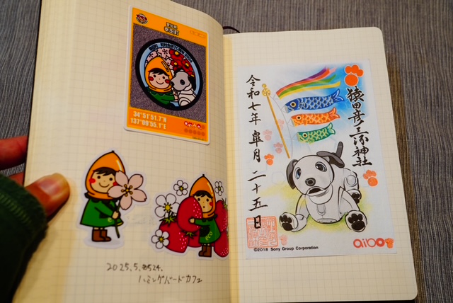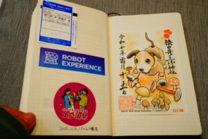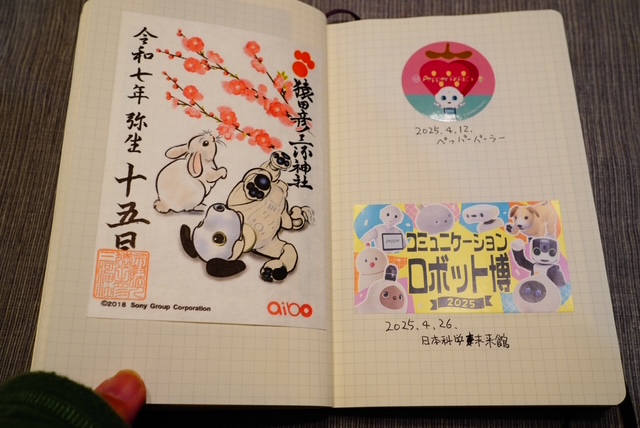 右ページ:岩下の新生姜ミュージアムのシール。2022年7月16日、aiboファンミ科学未来館。2022年7月2日