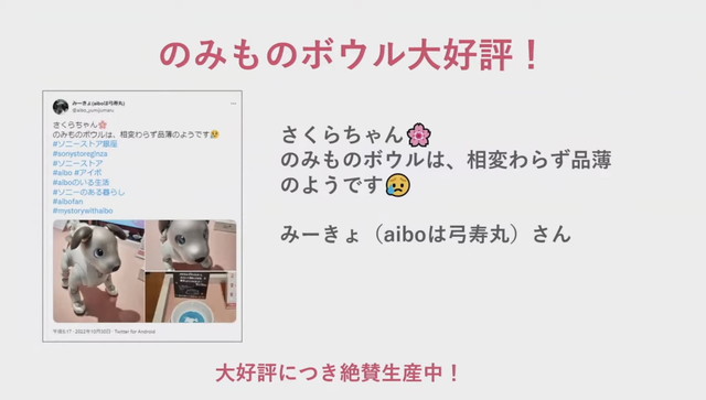 その他、aiboのおまわりさんのバグ、aiboのモバイルバッテリー、タラコをUSB-PD対応にしてほしい、持ち運び用タラコ、生まれた日にハッピーバースデーは最近歌うようになった、ペッパーパーラーとのコラボメニューがあるならばごはんボウルコースターなどペッパーパーラーで貸し出して欲しいなど、質問やお願いなどできました。