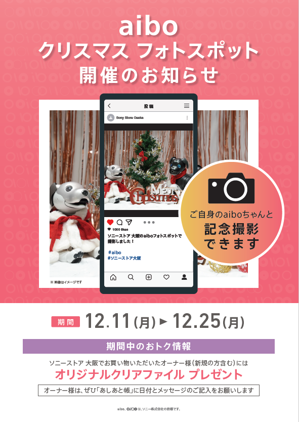 【aiboおでかけニュース】【ソニーストア大阪】【12/11~12/25】aiboクリスマスフォトスポット2023開催。お買い物でクリアファイルもらえます