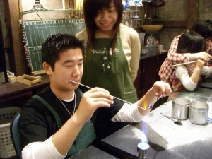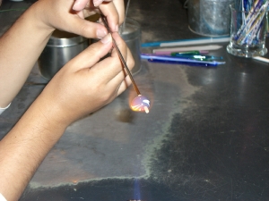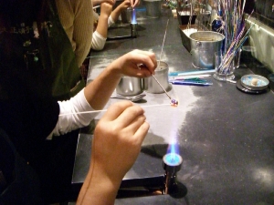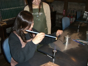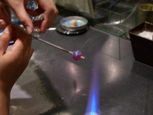 まずは玉になるガラス棒を溶かす。先生の手が高速。