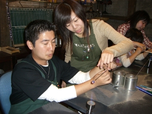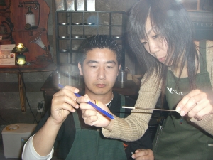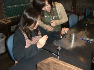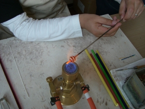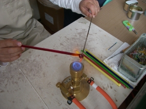 ガスバーナーでガラスを溶かしはく離剤が塗ってある鉄棒に巻きつけ模様などをつけていきます。